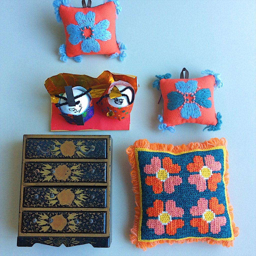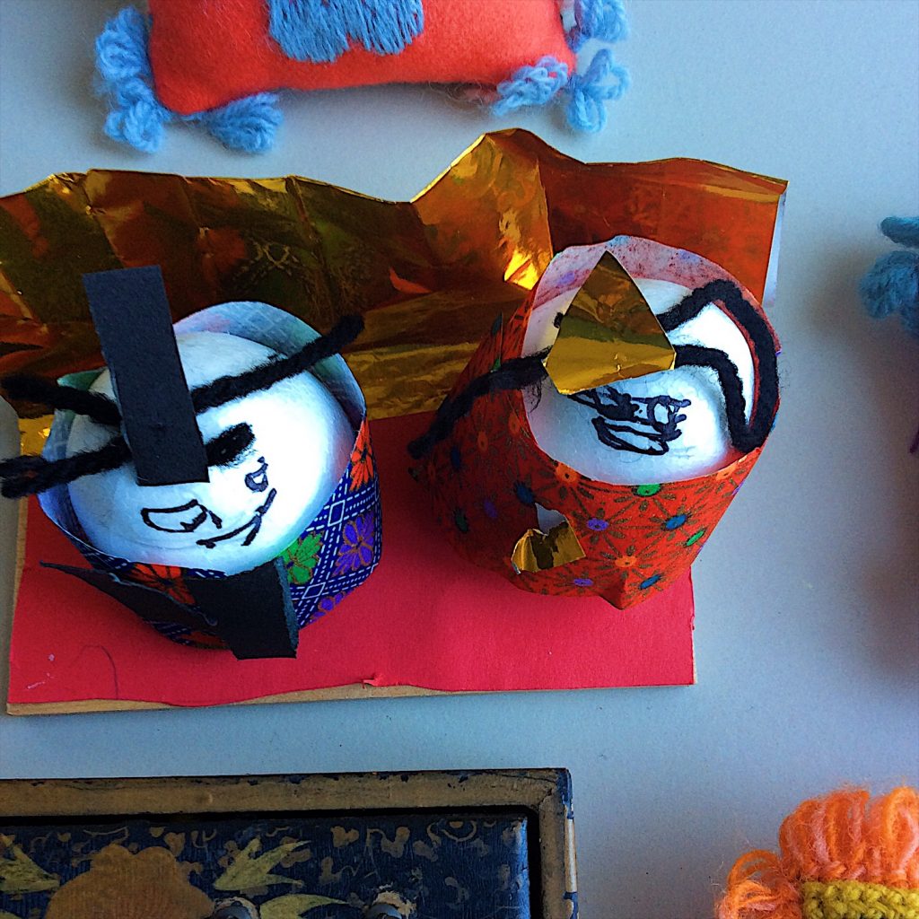 「明日はひな祭りだよー」と幼稚園から息子がお雛様を作って持って帰ってきました。それまでひな祭りのことすら忘れてた。「うちは女の子いないから、やらなくてもいいか」と言ったら、息子が「やった方がいいよ。この作ったお雛様を飾ったらいいでしょ」と言います。それで祖母の形見のミニチュアダンスを出して並べました。