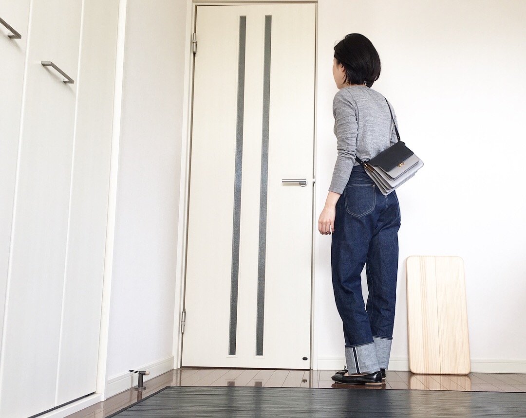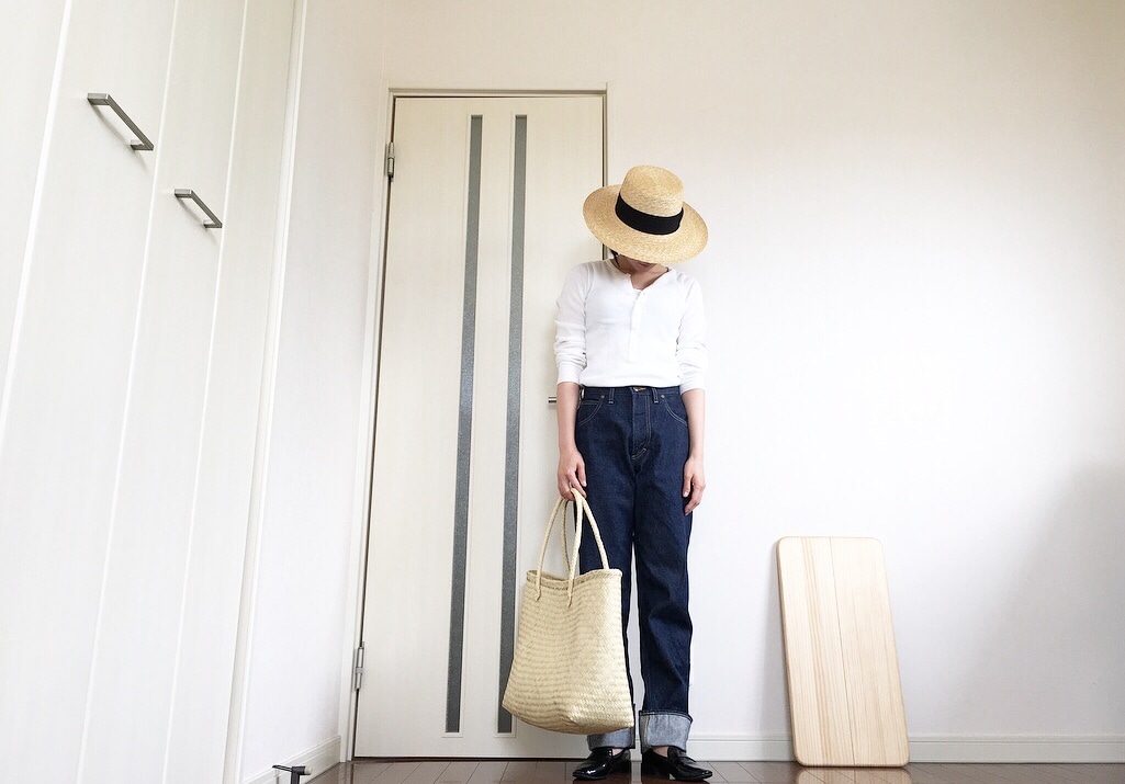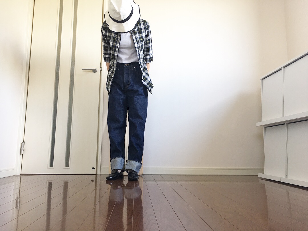 パンツは、ハイウエストチノを1回だけ折り返して履きました。