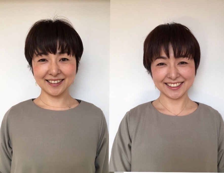 今回は、友人のご縁で、特別に自宅に来ていただきました。 工程の写真は撮れませんでしたが、 美容学校の講師をしているむくさんのお話は、理路整然と分かりやすく、なぜ、この道具を使うのか、使うことでどんな効果があるのかよくわかりました! また、友人と二人で受講したことで、奥二重の私と、二重の友人のアイシャドウの入れ方の違いや、眉の形や太さの違いで、使うアイテムが違うこと、違いを知ることで、自分の顔を、客観的に見ることができました? 左がビフォア、右がアフター。 写真だと、肌の質感が分かりにくいかと思いますが、ベースをしっかり(でも薄づき)作ることで、肌が全体的に明るくなり、眉を整えたことで、締まったような、、気がします。あと、チークの入れ方!左右手持ちのチークですが、入れ方で印象が変わるのがよく分かりました、左は、おてもやんみたい、、? ベージュ系の服が好きなのに、どうも顔がぼんやりしてしまうのが悩みでしたが、保護者会などのちょっと改まった場所にも着ていきたくて購入したevamevaのワンピースも自信を持って着られそうです。 大人としての身だしなみとしてのメイク、40代も楽しめるように、整えたいと思います(*´︶`*) アトリエむく