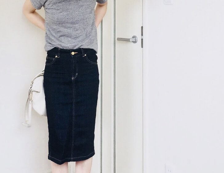 n100のTシャツに、デニムのタイトスカート。