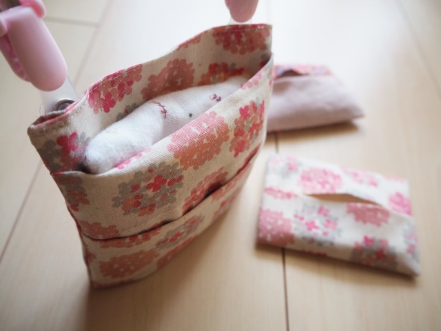 フラップ無し・マチ有り・ティッシュケース有りの移動ポケットを作りました。