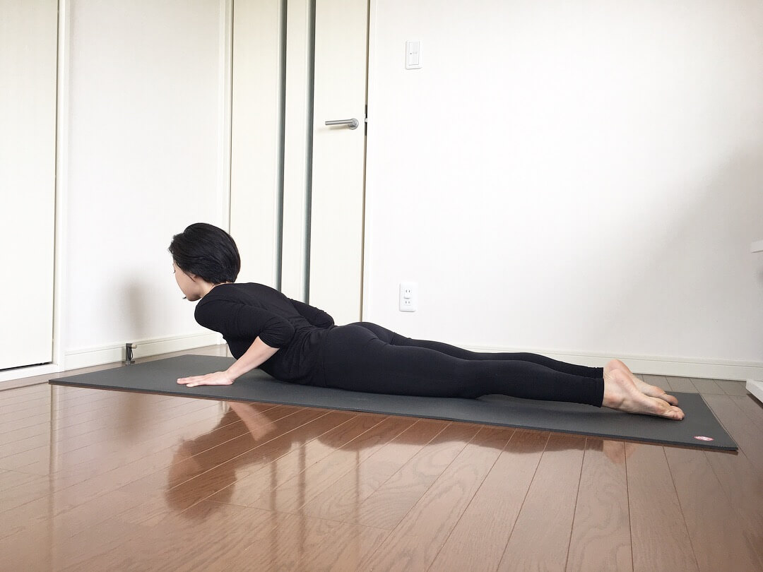 1.うつぶせの状態で、両足を肩幅より少し狭めに開いた状態でスタンバイします。
