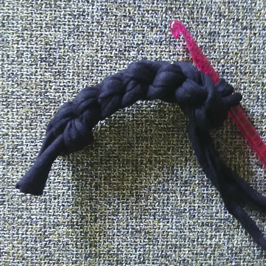 復活できないかなと、Tシャツヤーンで編み編みして付けてみました。