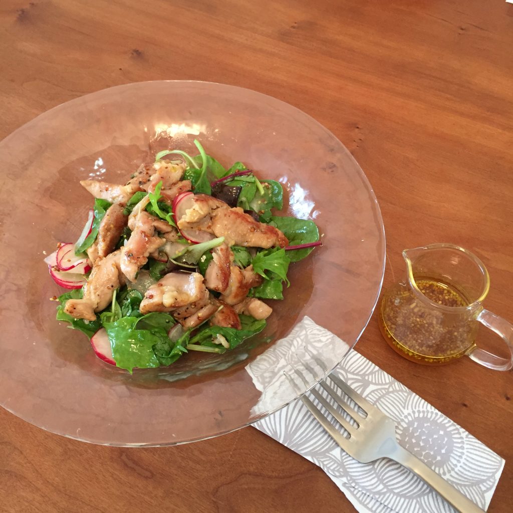 グリルチキンとベビーリーフ、塩もみラディッシュにかけて…粒マスタードもいいアクセントになって美味しかったです!