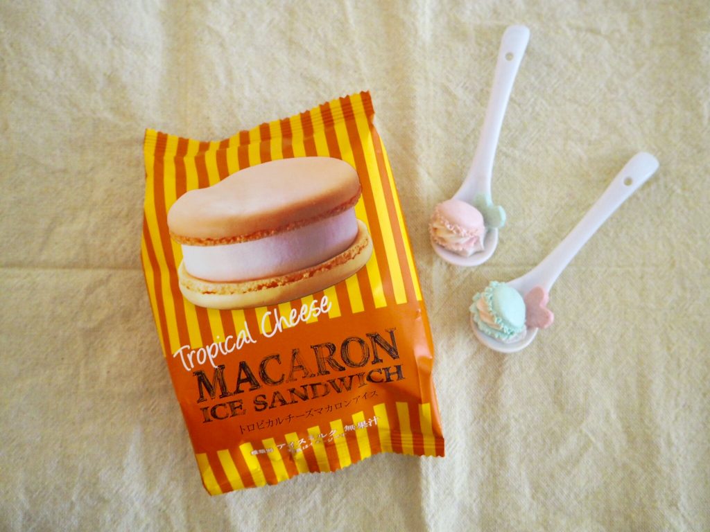 パッションフルーツとマンゴーのマカロンにクリームチーズアイスがサンドされています。
