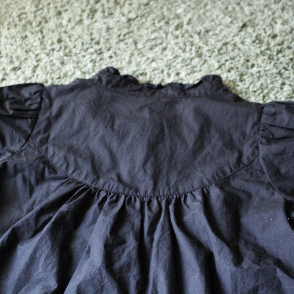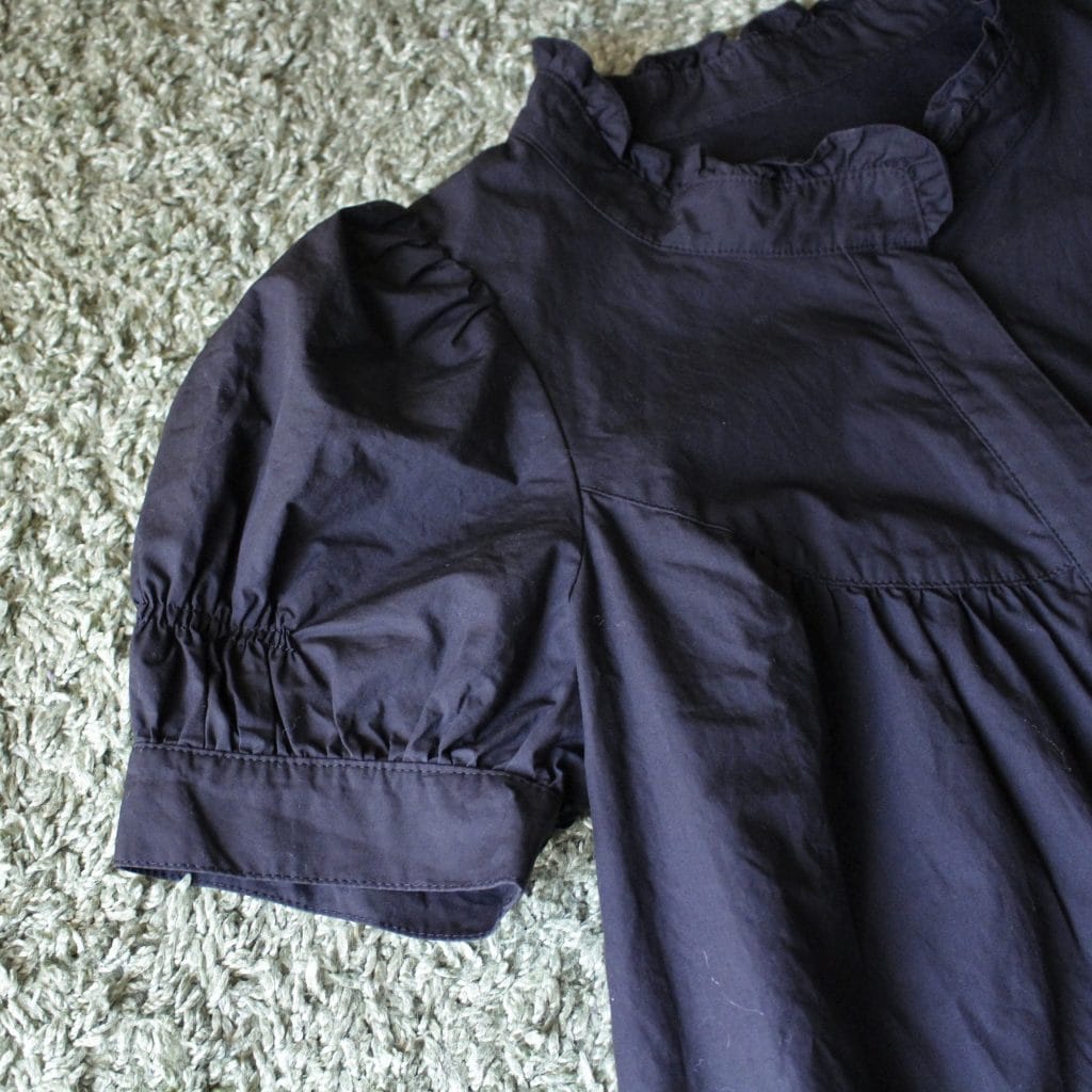 タック?入りのパフスリーブに、フリルのスタンドカラー