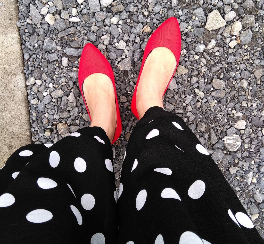 ドットだけでも派手なのに、靴まで真っ赤で、