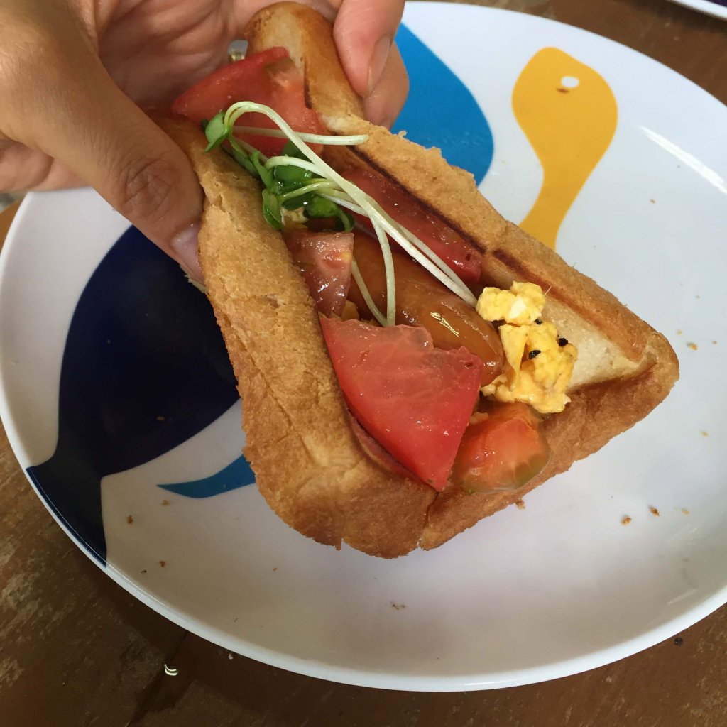あとは食パンをこんがり焼いて、トマトサラダ、スクランブルエッグ、カイワレ大根、ウインナーをのせて、挟んで、豪快にパクリ!