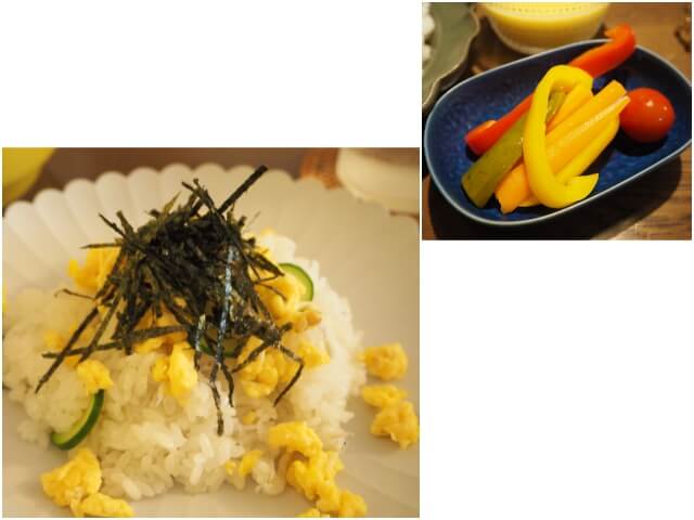 シラス、甘い炒り卵、梅酢につけた薄切りきゅうりを混ぜ込んだだけ。