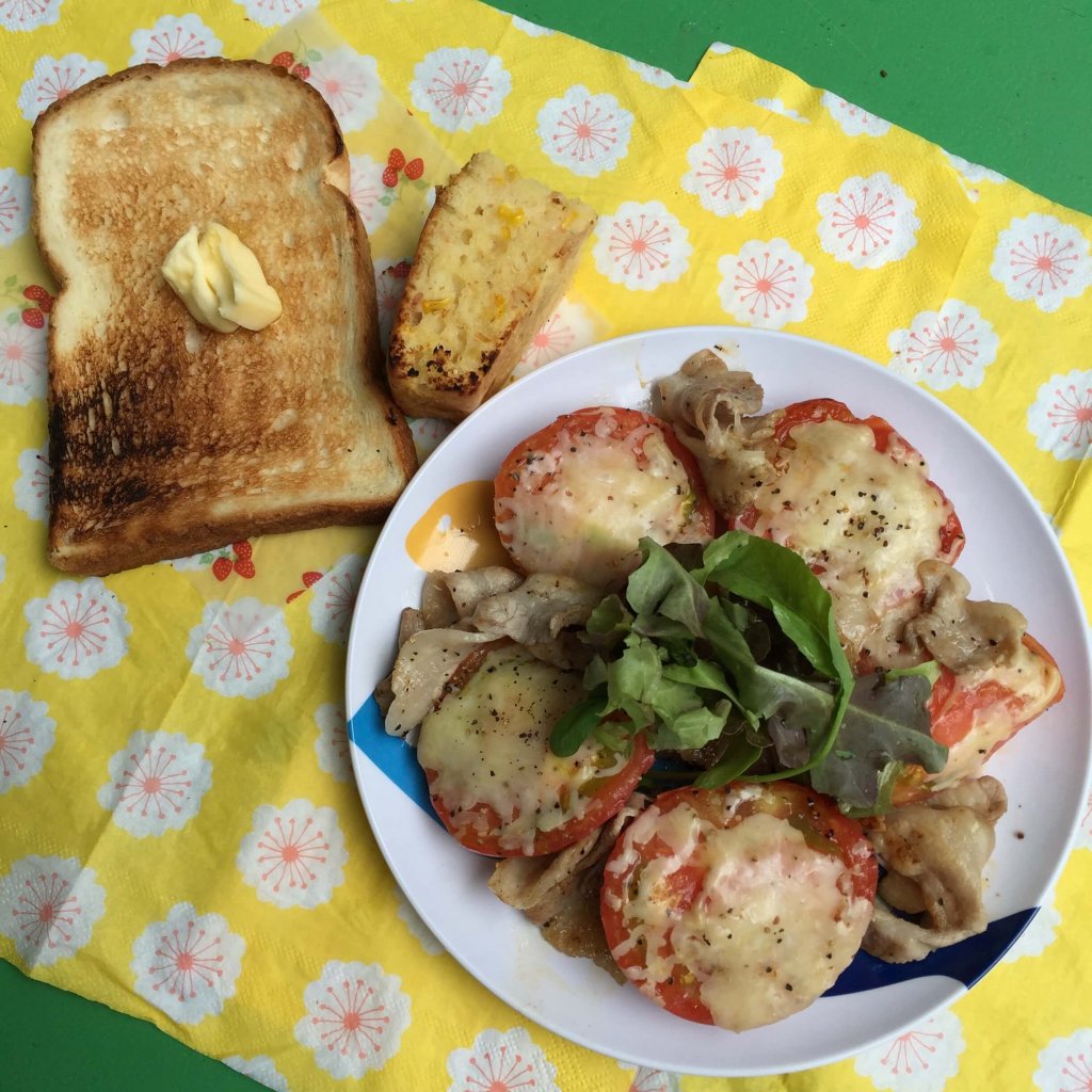 トマトのステーキみたいな感じ。トロけるチーズと一緒に食べたトマトはとってもジューシー。