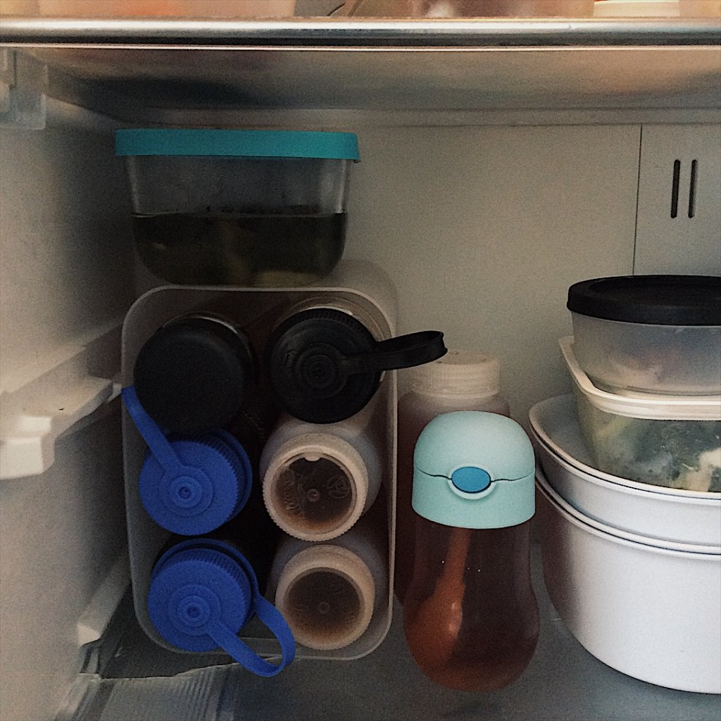 DAISO収納ケースで作った冷蔵庫の専用コーナー。蓋の色で分けて ブルー:夫 黒:私 クリア蓋:ステンレス水筒に入れる前の冷却用 自分のは直接口つけて飲んで、飲み干したら、食洗機にいれます。 500ml容器がものすごい勢いで空になっていきます。