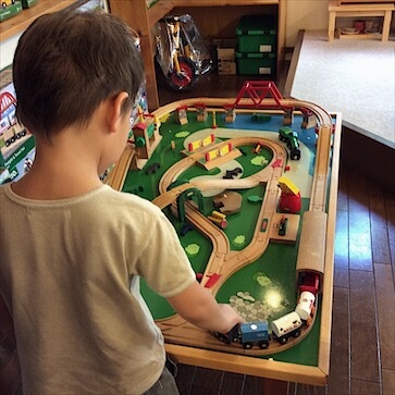 こちらは上賀茂神社近くの木のおもちゃやさん、トイハウス童。 こちらのプレイコーナーも赤ちゃんのときからお世話になってます。 どちらも遊ばせてもらうだけでなくて、BRIOを買っています。 遊ばせてもらったら、ちゃんと買わないとダメだと思ってます。