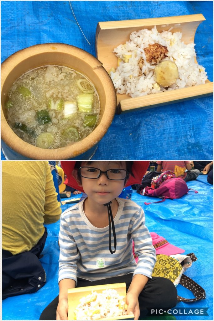 おそらく学生の時以来でしょうか。飯盒で炊くご飯…。なんて懐かしい。今回は自分たちで剥いた栗を入れ、炊き上がったほんのり塩味の栗ごはんはお代わり必須の美味しさ。竹の器がまた美味しさを引き立ててくれます。