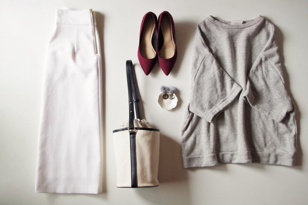 SLOBE IENAのタイトスカートとwhimgazetteのスウェットを合わせたホワイト&グレーのコーデ。