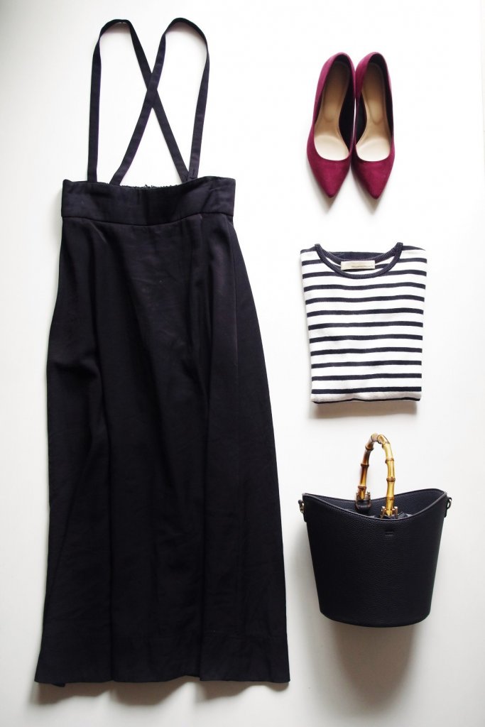 夏のSALEにて購入したROSEBUDのサロペットスカートと細めのボーダートップスを合わせたコーデ。