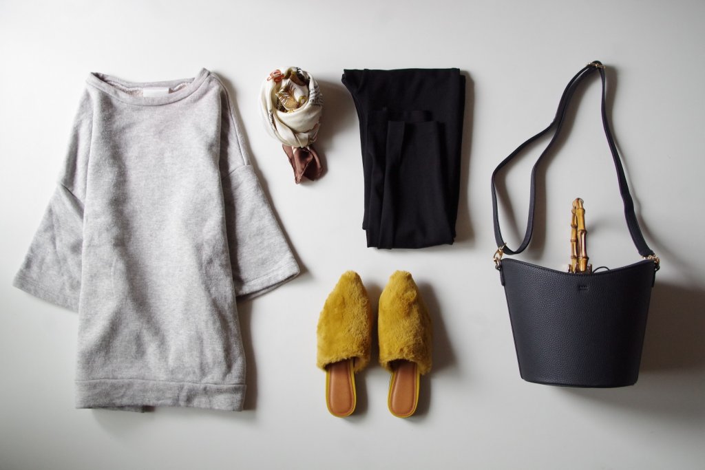 whimgazetteのスウェットは大きめなので、下にguのレギンスの合わせて、ちょっと近所にお買い物などラフなコーデの時にしゅっと履けそうです。