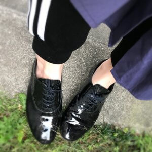 ゴツいリュックと合わせたかったので、カジュアルになり過ぎないようにレペットのエナメルオジ靴でドレスダウン。