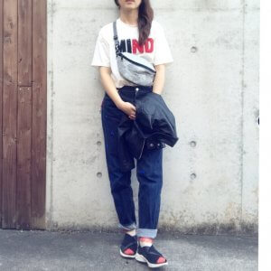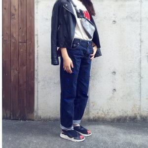 このTシャツも、デニムも、フェイク革ジャンもエアハラチもほぼシェア。