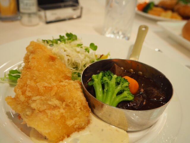 サーモンのミルフィーユフライ ・牛ホホ肉赤ワインソース煮・パンがセットになっています。