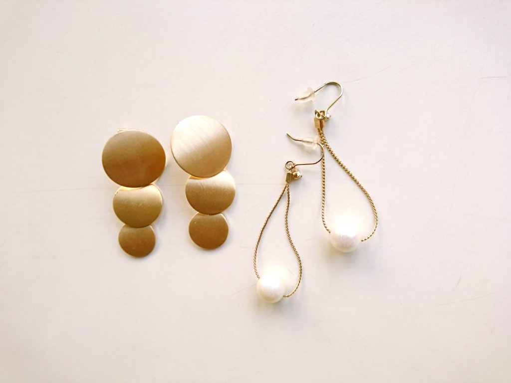 シンプルなコーデの時は左のモードなピアス、デイリーなお洋服を可愛く見せたいときは右のパール揺れ揺れピアス♡