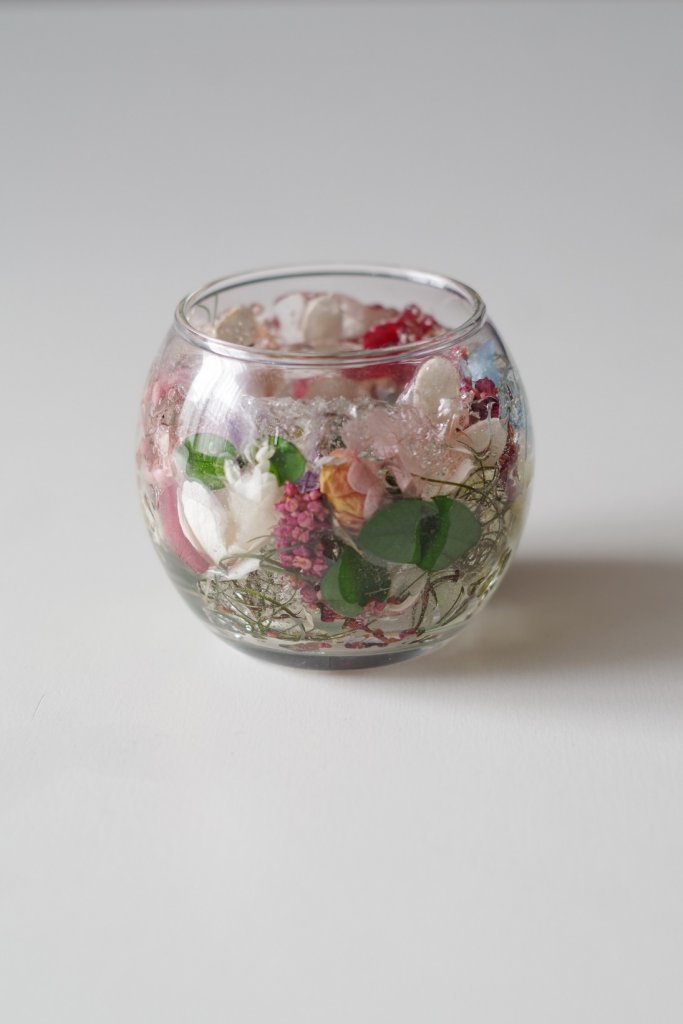 ドライフラワーをポットの隙間に敷き詰め、専用のジェルをいれるのですが、私が欲ばってお花をいれたばっかりにジェルがなかなか入らずで?、先生に助けてもらい、オンリーワンのキャンドルポットができました。
