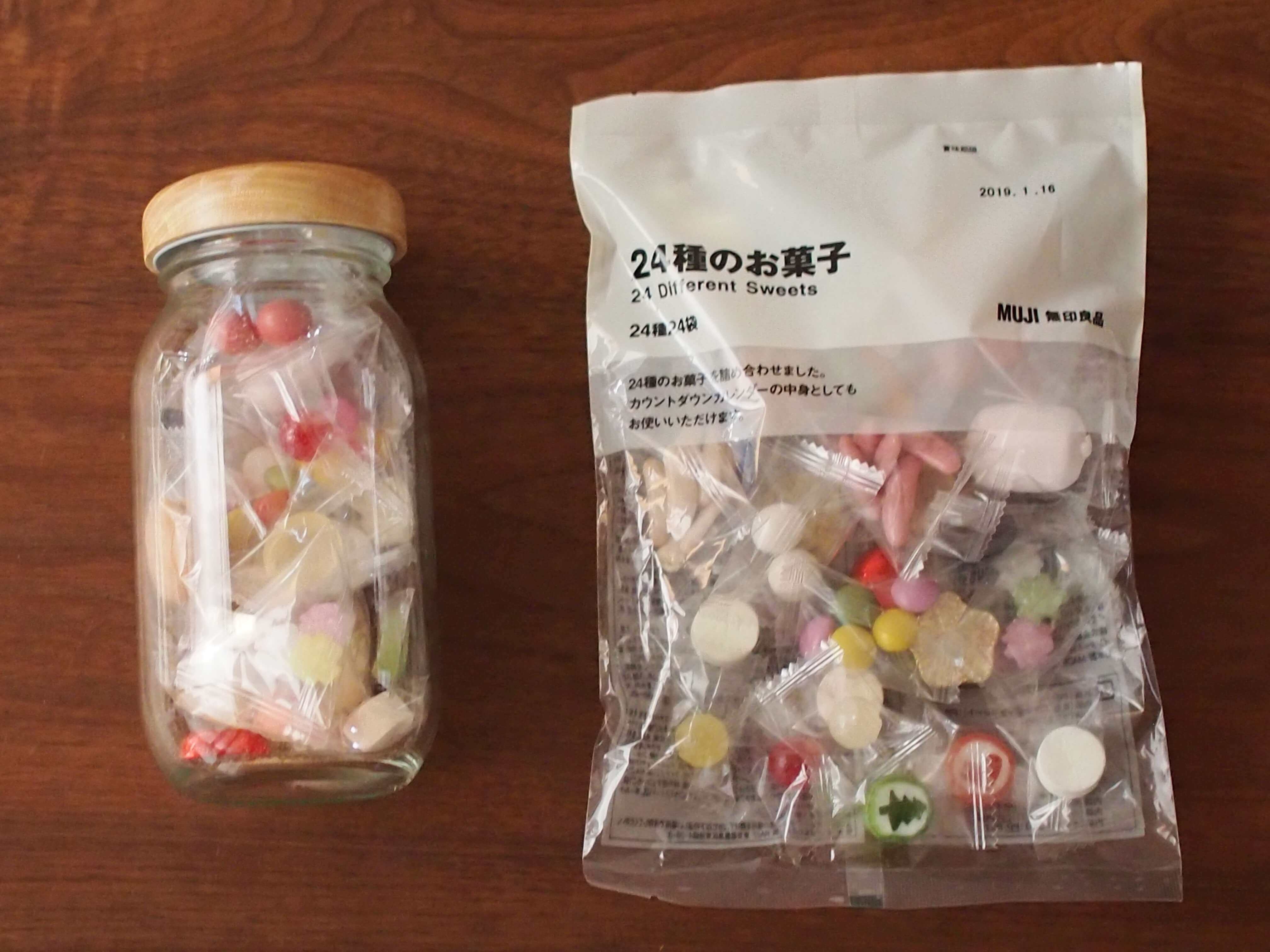今年は、毎年買っている、24種のお菓子を、瓶詰めしました。←手抜き
