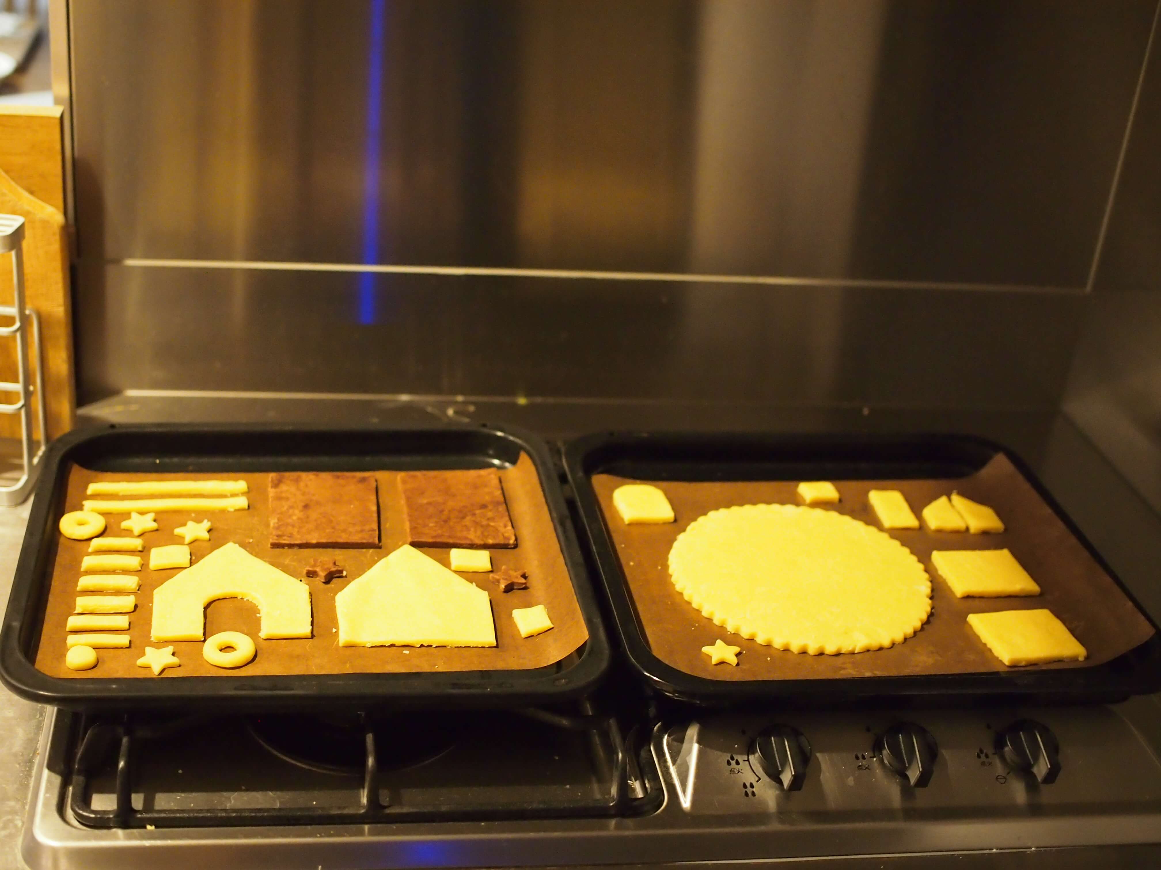 前日に、クッキーを焼いて、(型紙は以前購入した無印良品のを再利用してます。なので、毎回同じ家。)