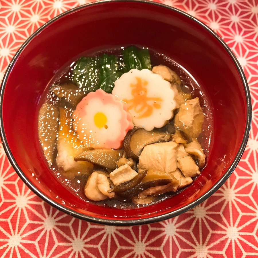 私の実家流のシンプル雑煮。鶏肉・しいたけ・小松菜・なると。大人にはゆずを散らします。