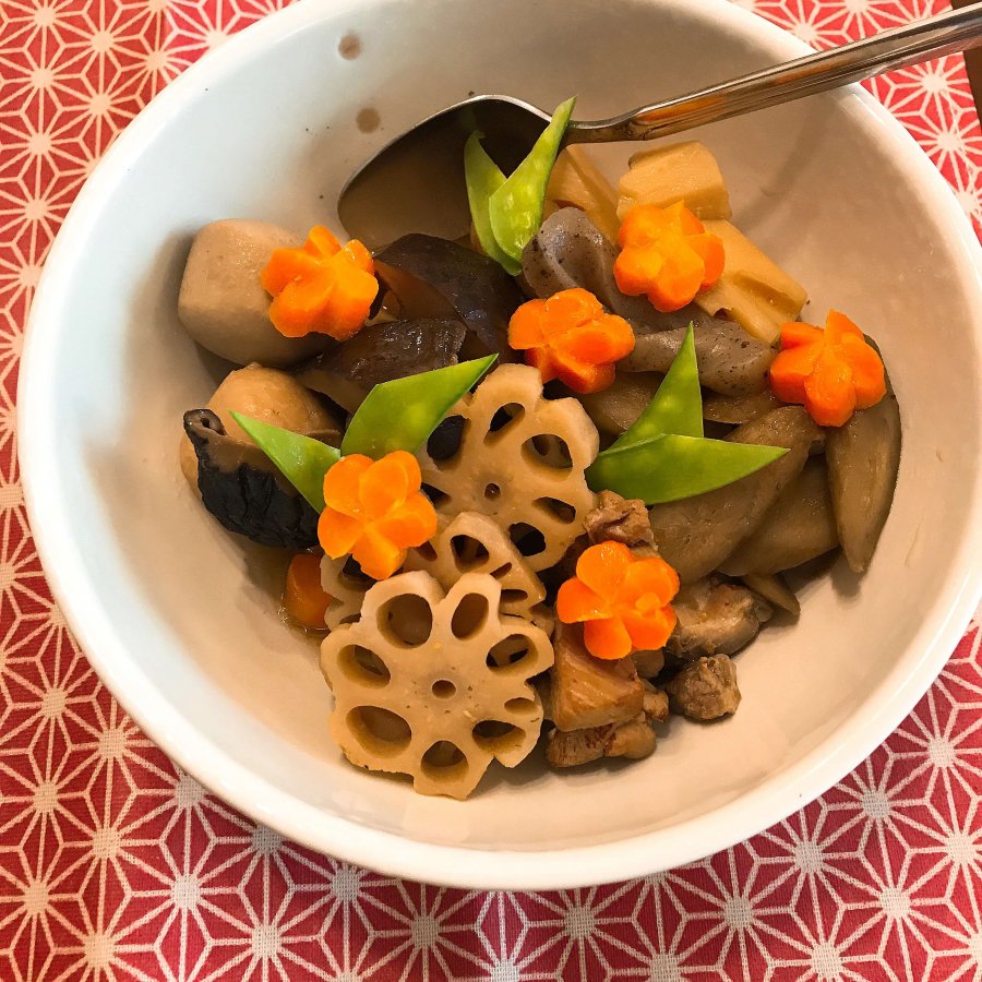 どんこの戻しに半日掛けますが、あとは圧力鍋任せのお手軽煮物。普段からよく作りますが、飾り切りが加わるだけでグッと華やかになりますね!