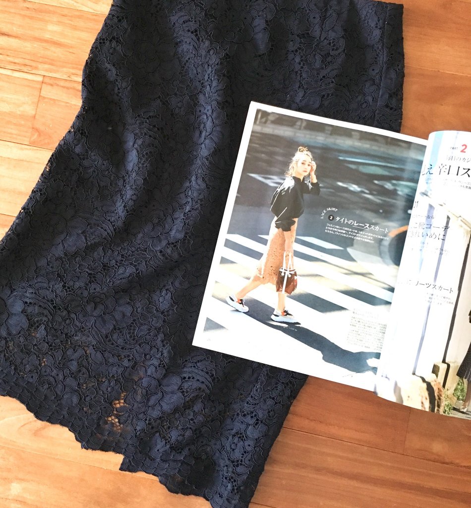 GUのレーススカート、膝下丈でストレッチが効いていて、見た目以上にとっても履きやすいです。