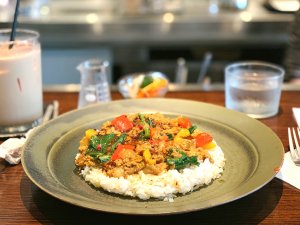 シトシト小雨が降る中、少し久々に、オクシモロン(OXYMORON)へ行きました。前回→OXYMORONの和風キーマカレー他。 「今日のカリー」を選択!「彩り野菜の鶏そぼろカリー」です。彩り野菜はパプリカとケール(?かな?自信なし…)。酸味をきかせた特製ソースが仕上げにかかっているらしく、爽やかな口当たりでした◎ドリンクは、やっぱりアイスチャイ。 オクシモロンの名物、クルミのお菓子も付いて来ます◎ … 続きを読む 久々にOXYMORONへ。彩り野菜の鶏そぼろカリー。