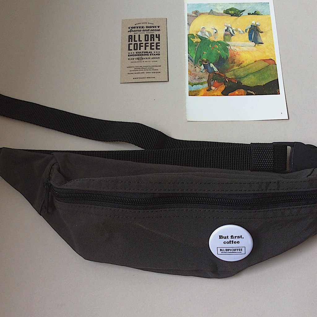 人気のトートバッグは京都でも結構持っている人がいるので、カブるのが恥ずかしくて 缶バッジを買ってみました。MUJI LABOのウエストポーチにつけてみました。