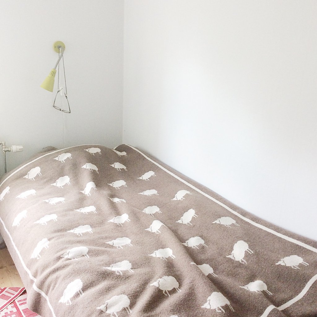 学舎は1階が教室、食堂、シャワールーム、2階にはベッドルームが5部屋あり、 あちらこちらにひつじ柄ブランケットが使われていました。 ひじかけ椅子に敷いてあると座りごごちがとってもいいです。