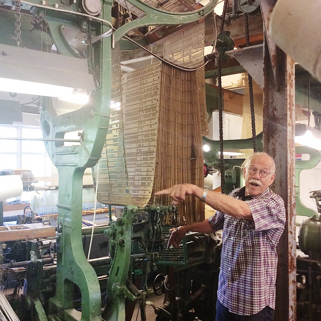 工場内は撮影は禁止だけれど、一緒に人が写っている構図に限り 許可してもらいました。ボリエさんが指さしているのがパンチカードで この穴に、ひつじ柄の模様の通りに織れる秘密が隠されているそうです。 触っていると、機械で織ったといっても、人のぬくもりが伝わってくるような 少し不揃いなところもあって、暖かい、厚みのある毛布です。