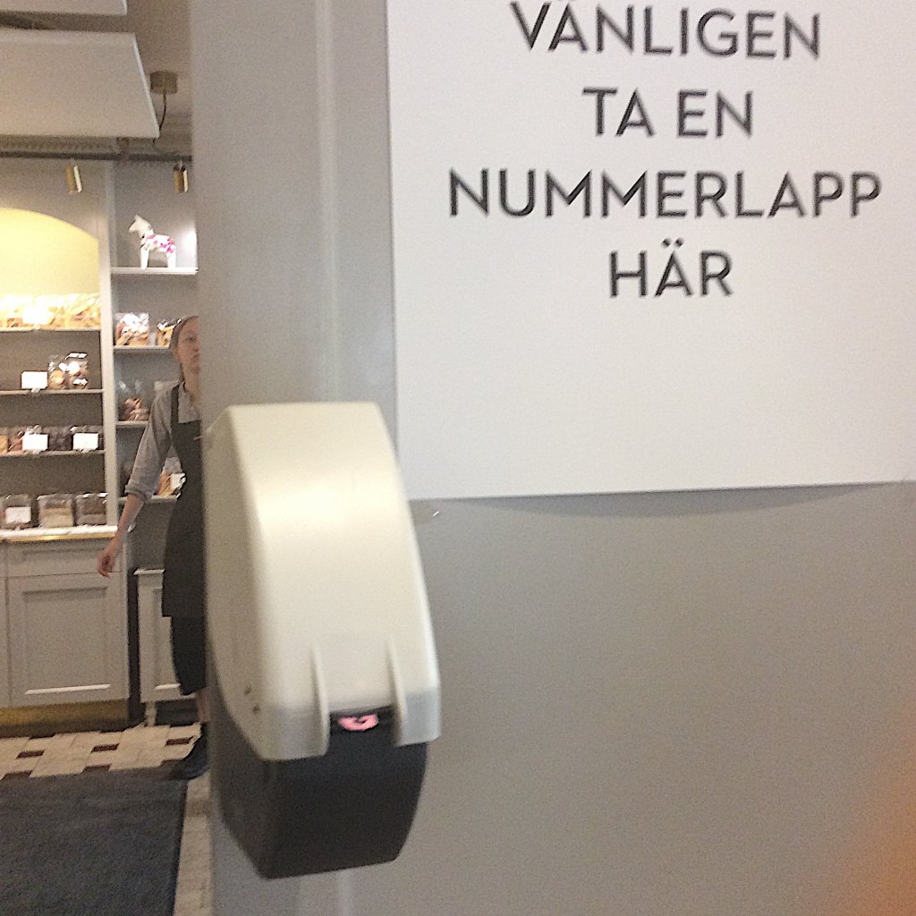 kungaesgatanという通りにある本店は、お買い物フロアと喫茶フロアに分かれてます。 買い物をしたければ、ここで番号札をとって、案内板に番号が表示されるのを 待ちます。