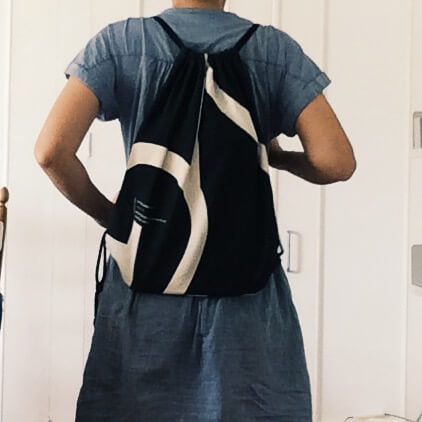 リュックを選びました。背負うとこんな感じ。 生地は分厚くて丈夫なものが使われてます。