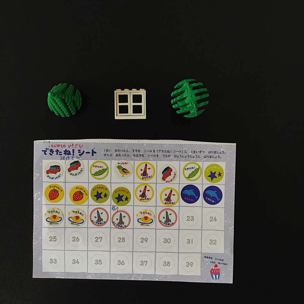 表裏1枚終わると1枚シールが貼れるのですが、 なかなか進まず。2日で1枚くらい? 全部貼れた日には私が泣きそう。 あまり無理強いしても何にも身に付かないし、 本人が頑張ろうという時にちょっとずつ。