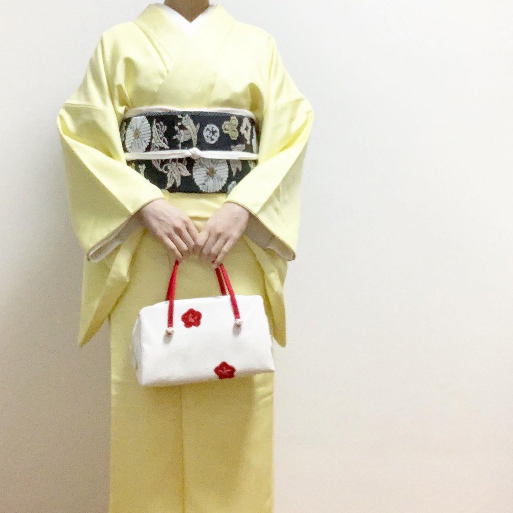 この日はイエローのナチュラルタッサーに唐織の宝尽くし帯を合わせておめでたい雰囲気のコーディネートでした。