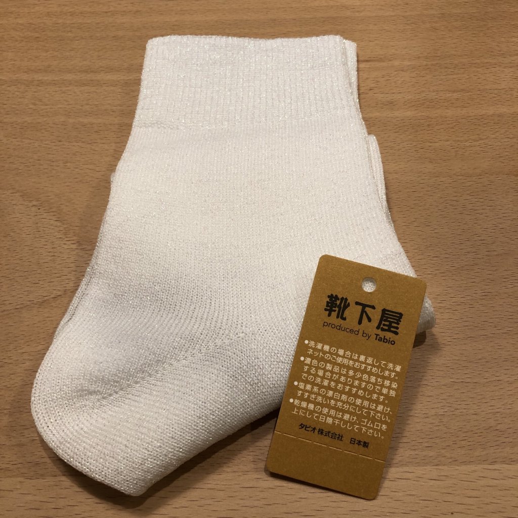 友達のアドバイスは、トップスが白だから白の靴下を選ぶなら、のっぺりした白ではなくて、ラメ入りだったり、ふわふわだったりがオススメと!