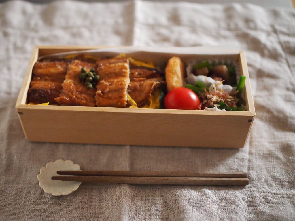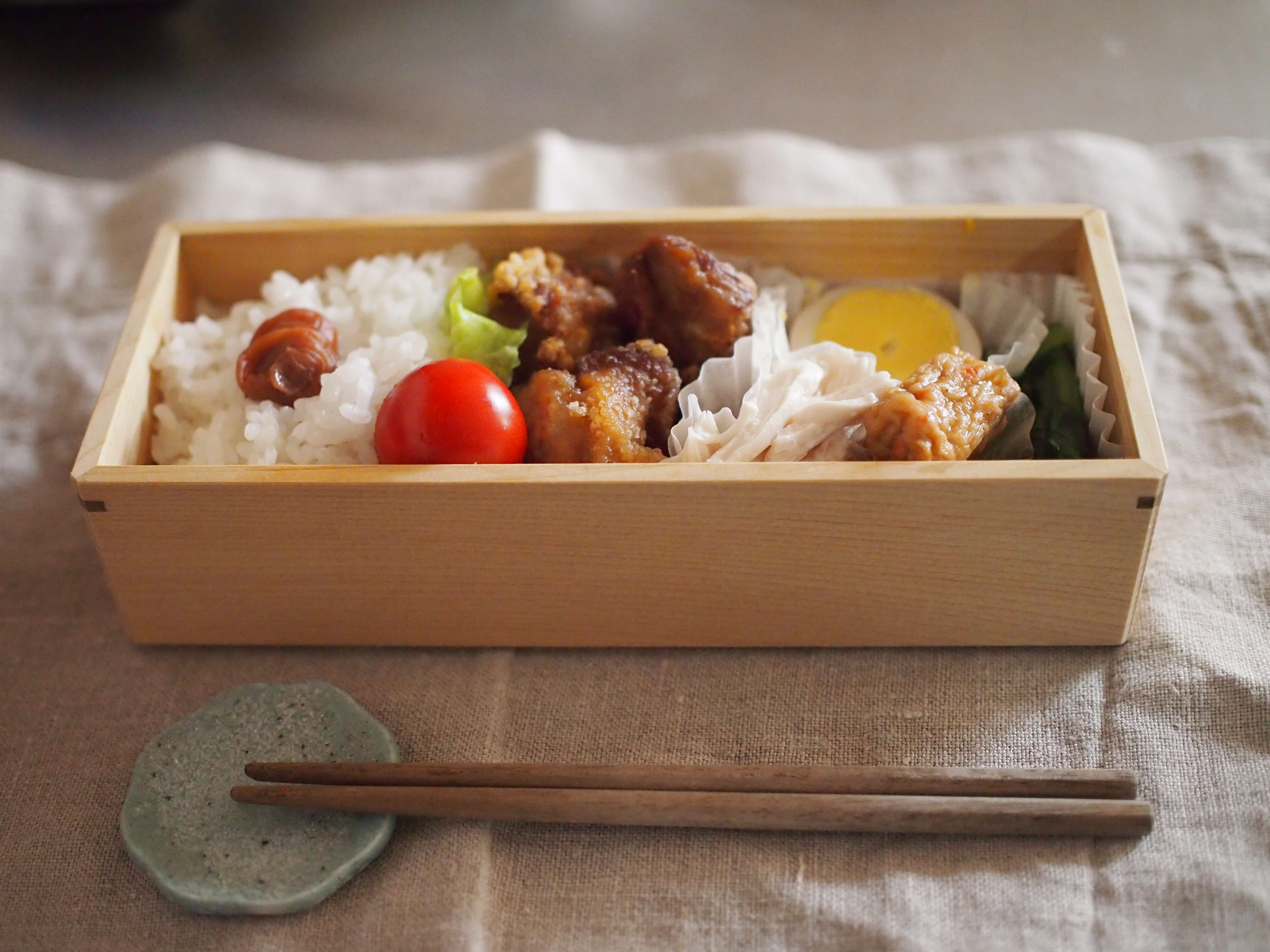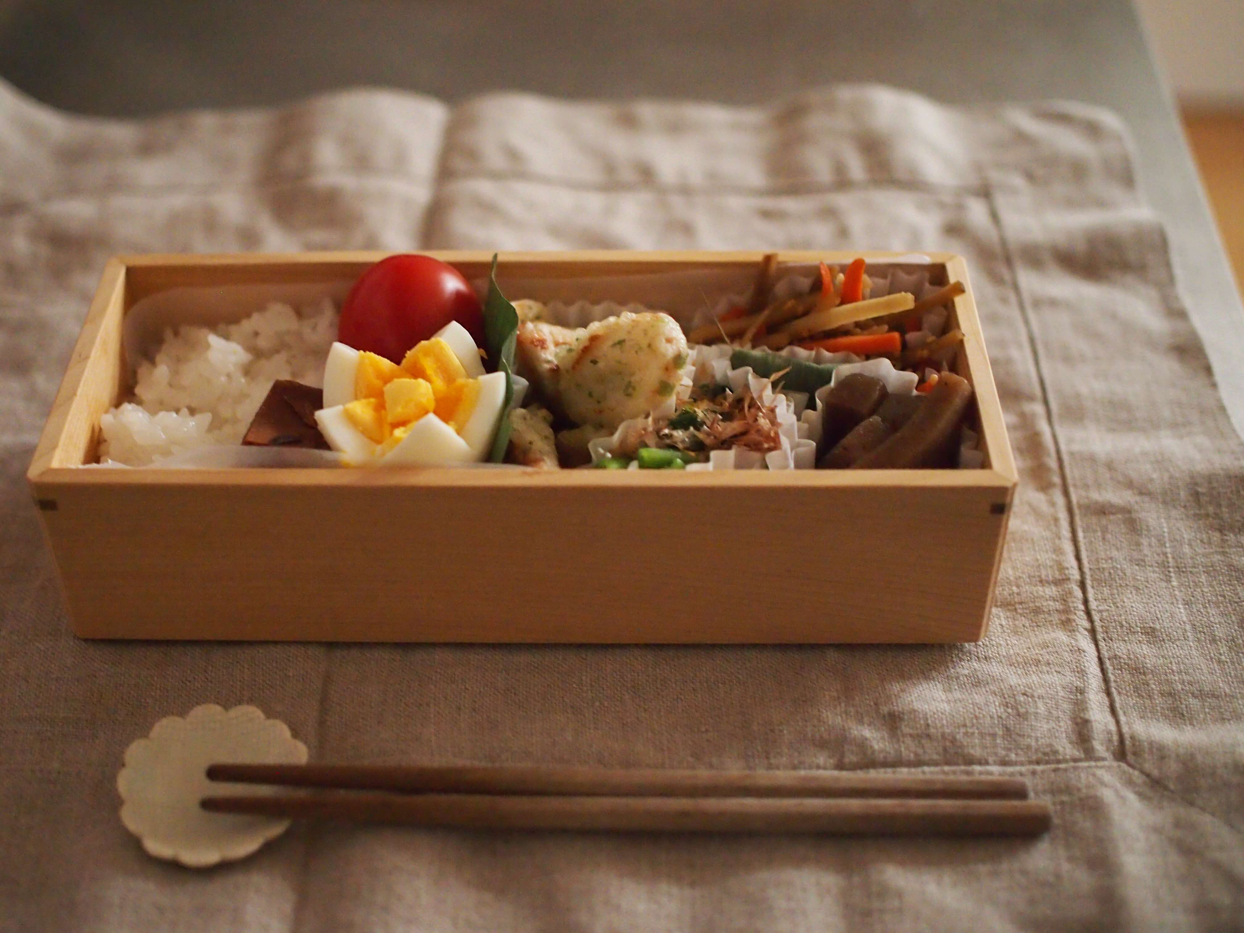 一応、クッキングシートを敷いて使っていますが、このお弁当箱は、白木にガラス塗料を塗っていて、汚れが付きにくくなっているので、扱いやすいです。