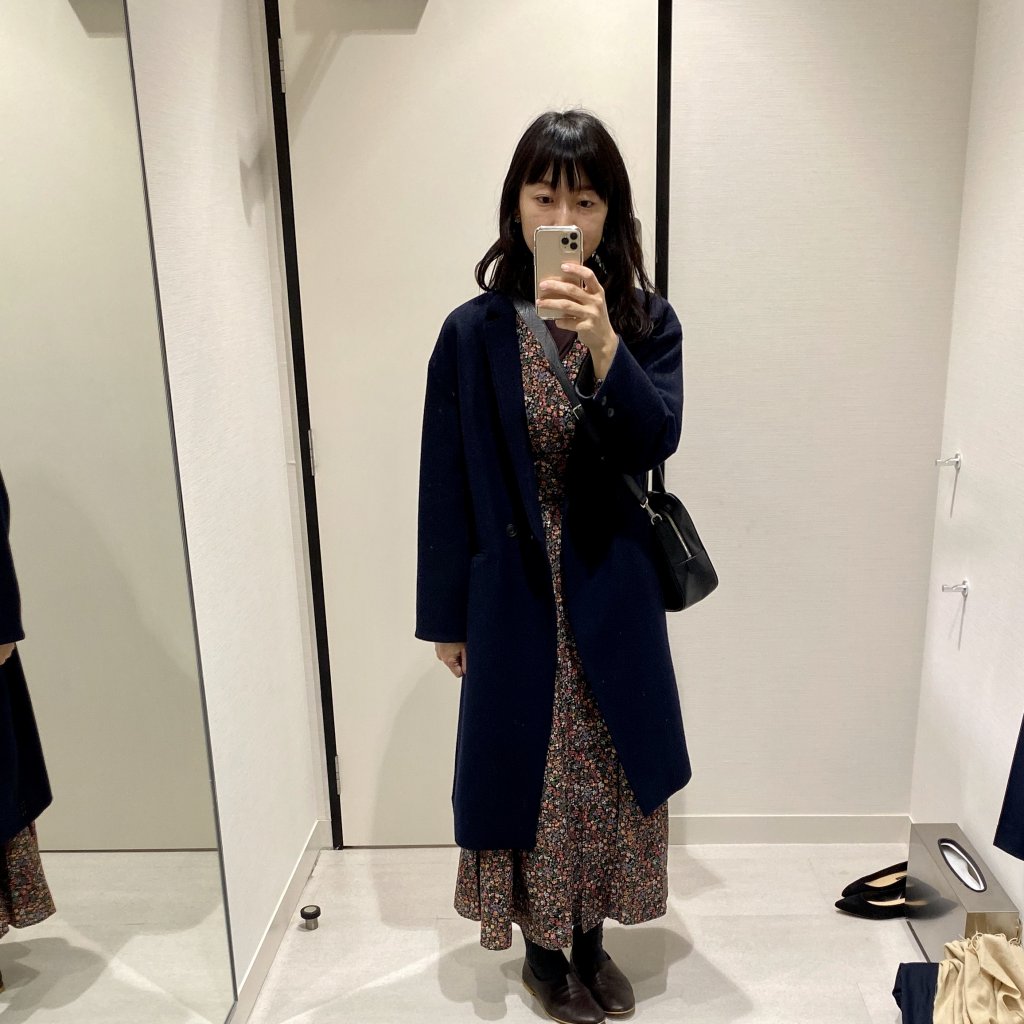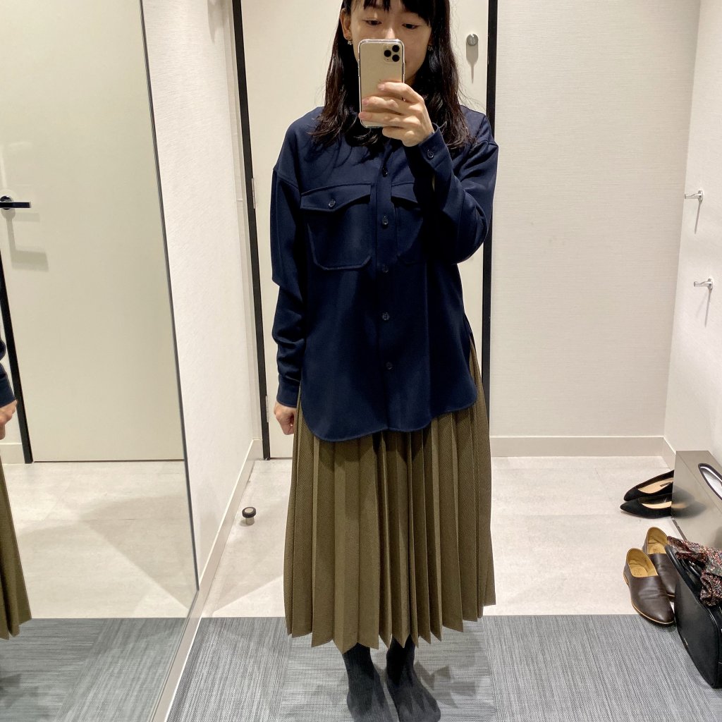 いくつか試着したなかで、12closetの福田麻琴さんコラボ「後ろゴムプリーツスカート」 と「あったかシャツジャケット」が気になりました。12closetのプリーツスカートは別デザインを既に愛用中ですが、今回はこちらを試着☆