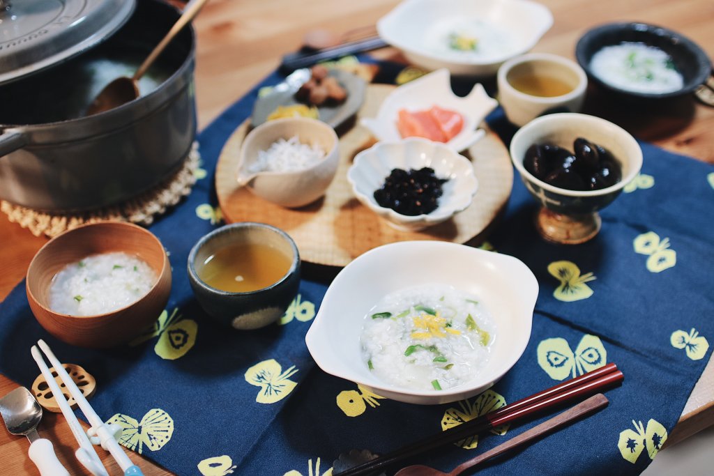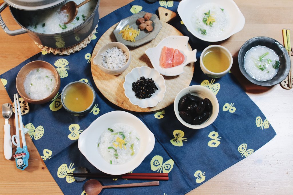 我が家は毎年、鶏がらスープで味付けして胡麻油をたらりと垂らした、中華粥にしています。