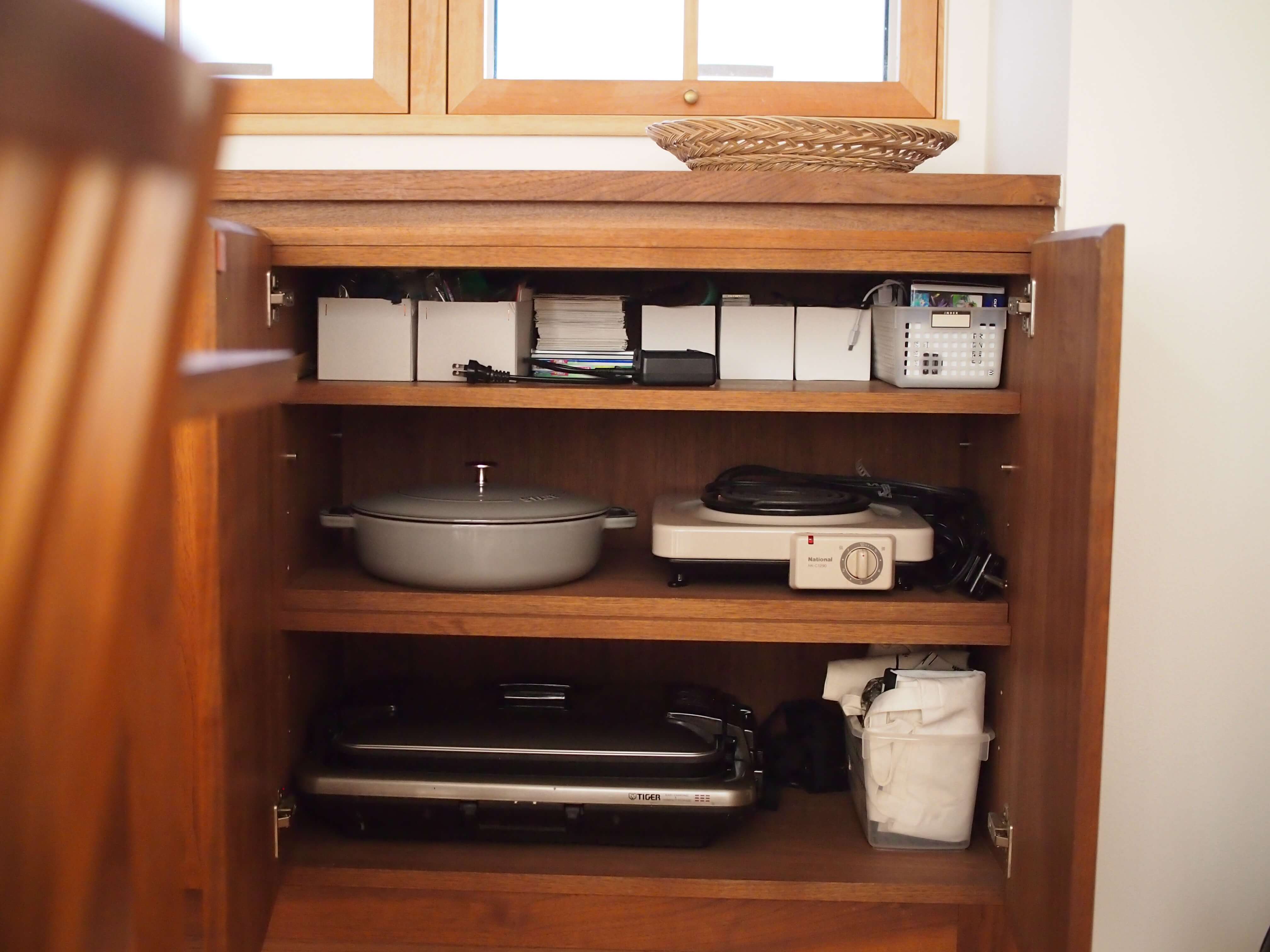 大きい調理器具を買うときは、収納場所が必要で。今まであったものを動かせたので、窓際の棚に収納しました。