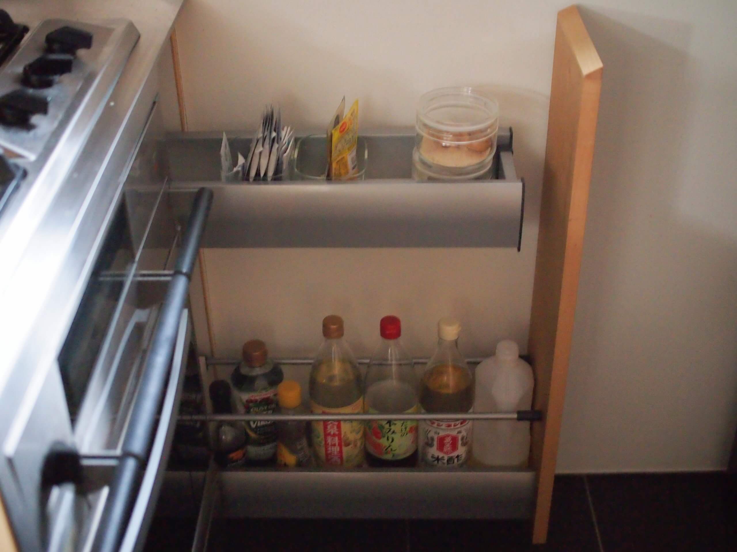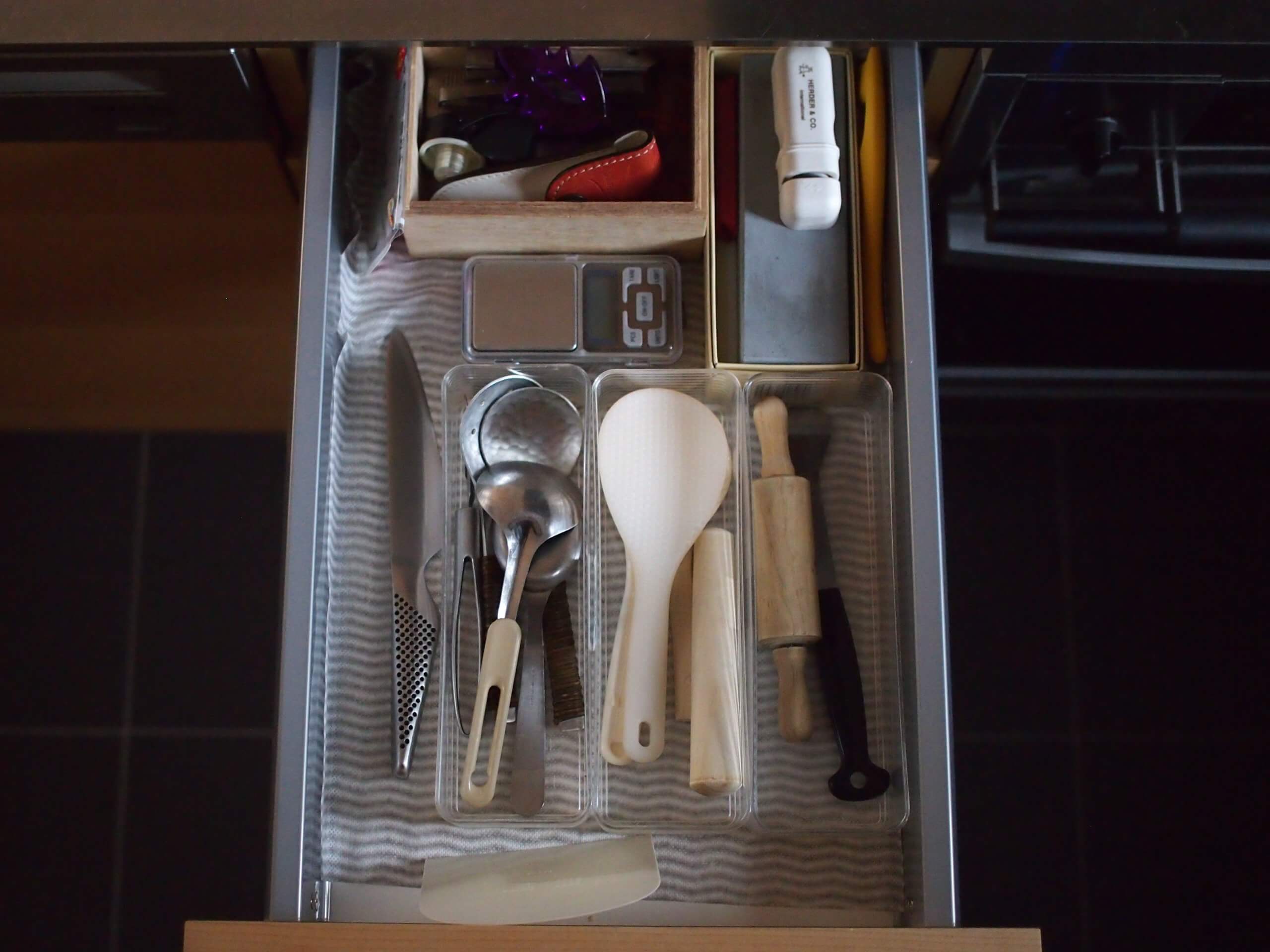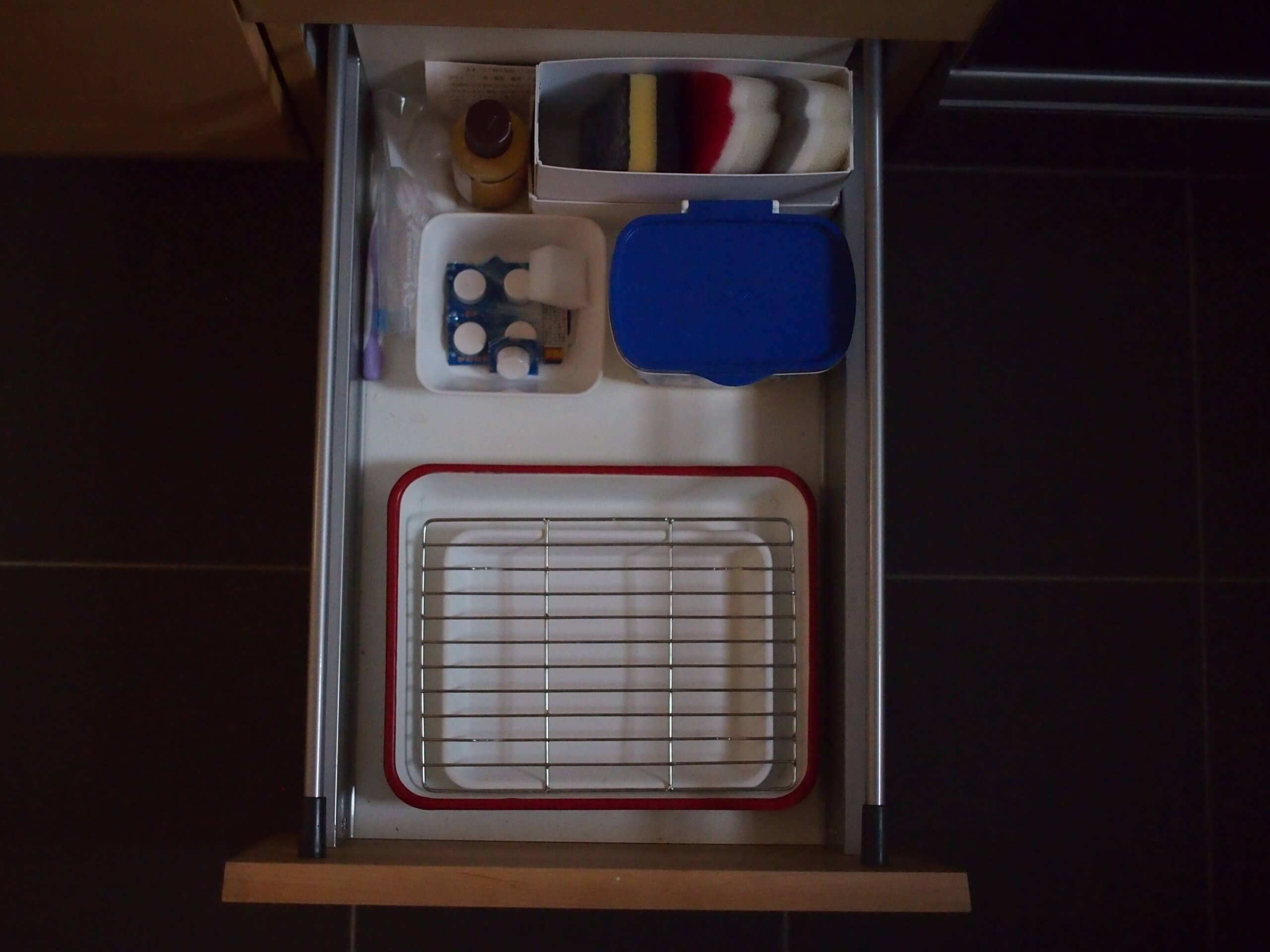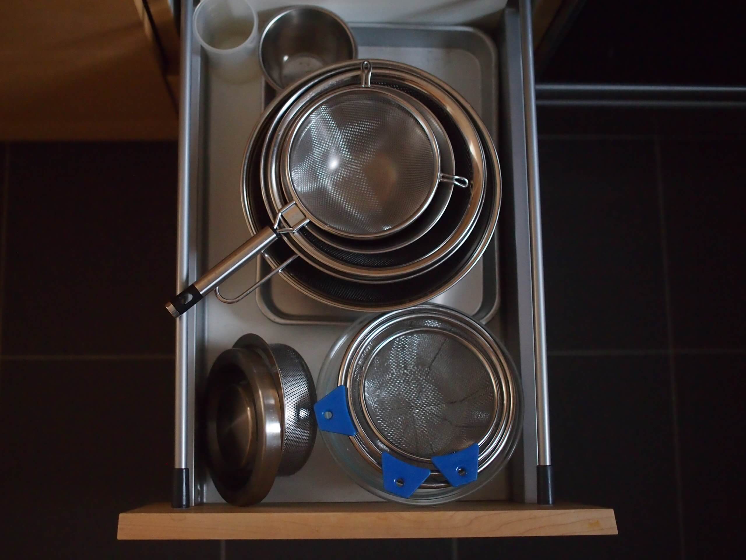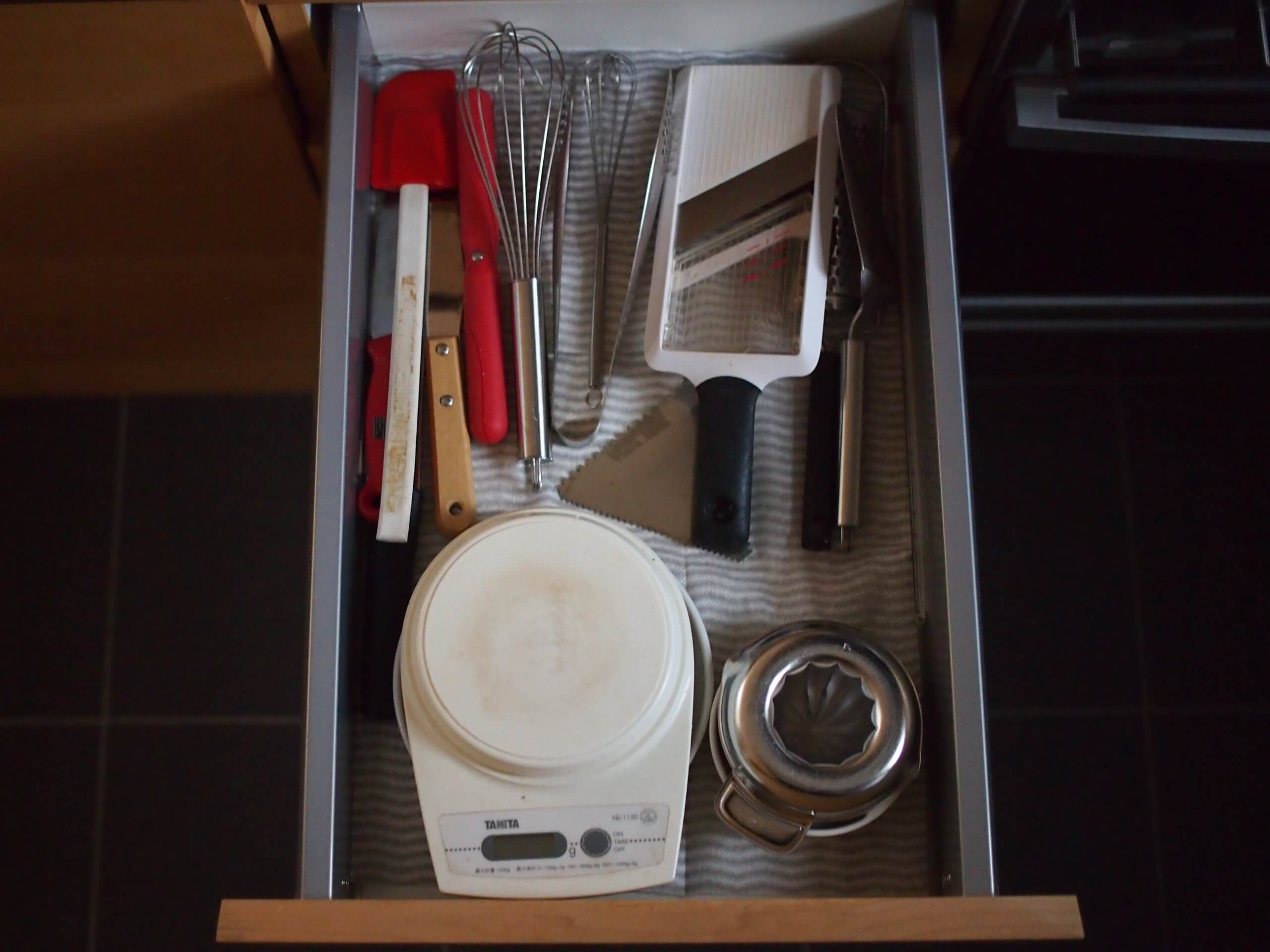 キッチンの前面は、食洗機にガスオーブンを入れているので、引き出しが広くないのですが、こちら側に入れた方が便利なものもあり、引き出しの中がごちゃっとしていました。