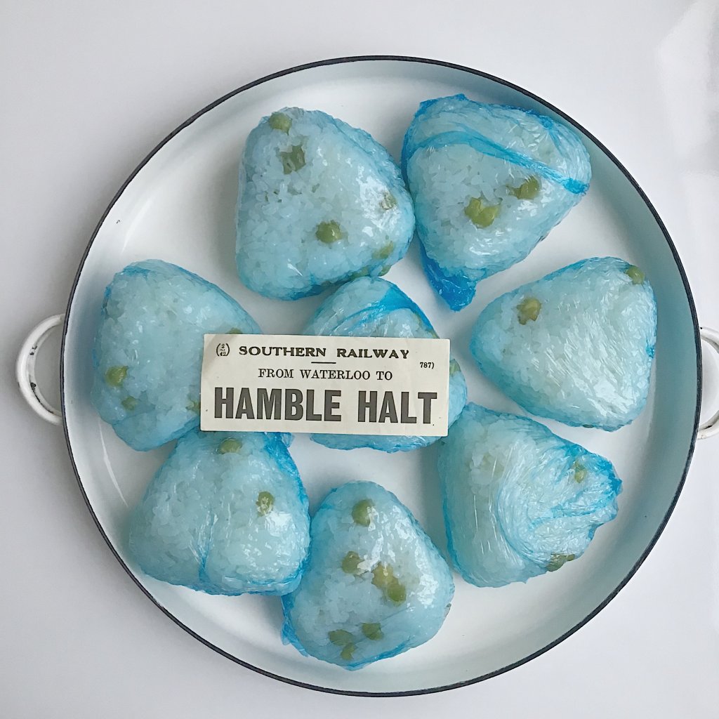 血色悪そうな豆ご飯おにぎり。デザートはトップ画像の