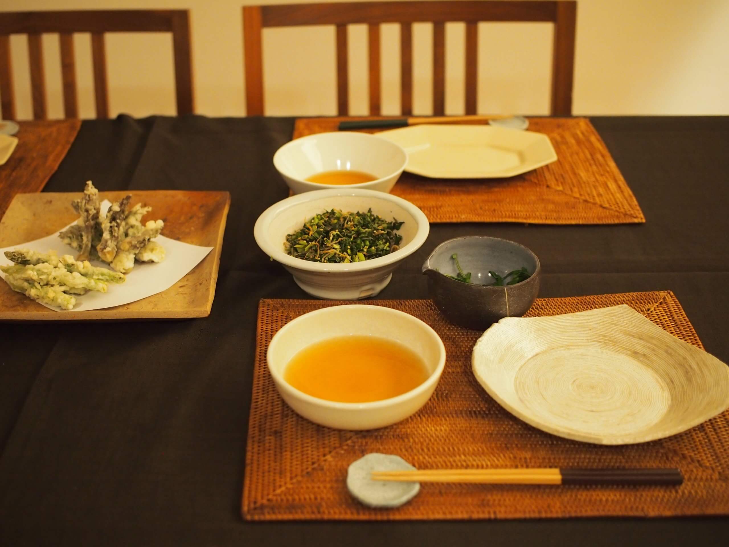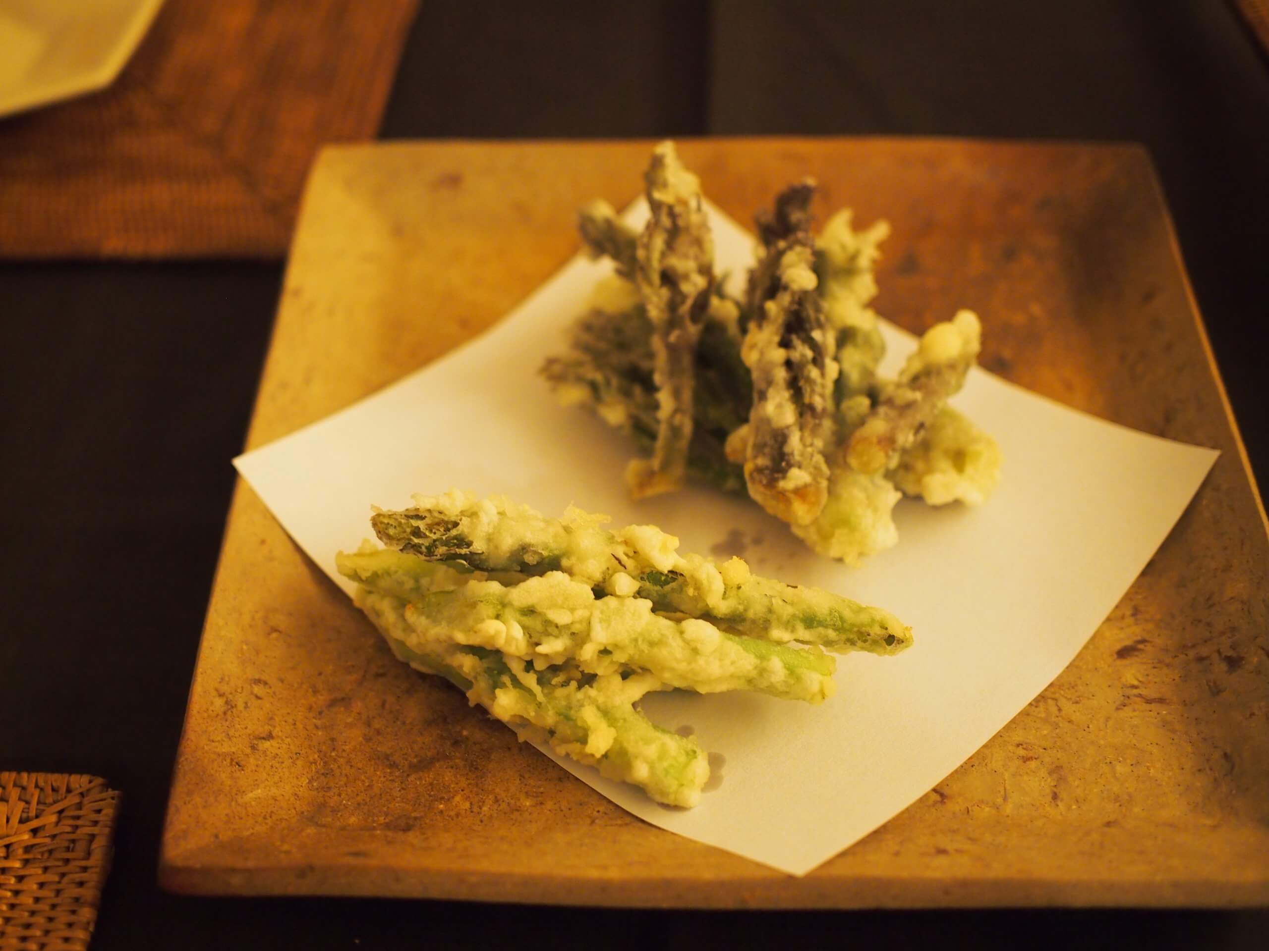 ふきのとうと、アスパラガスの天ぷらをのせた日。