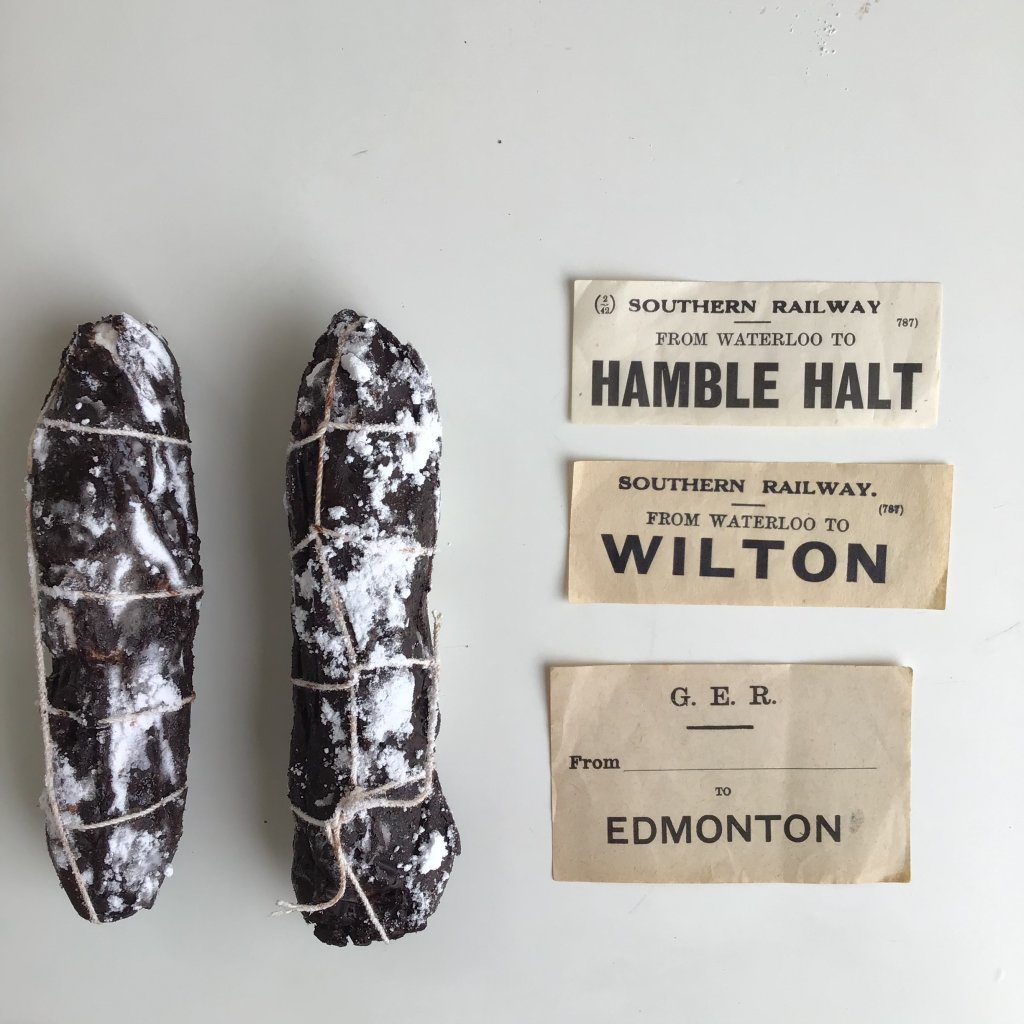 サラミチョコレート。タコ糸をかけてサラミに見立てます。
