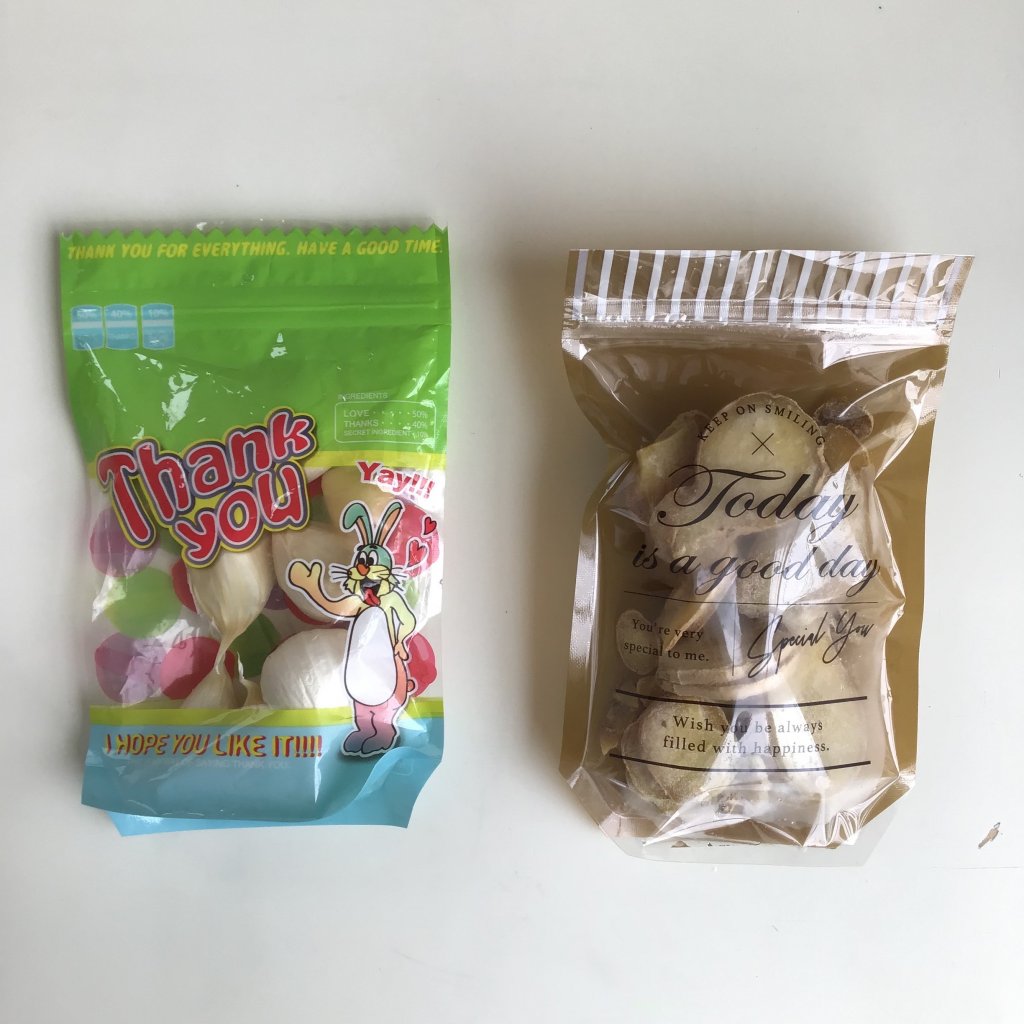 今回もダイソーのラッピングを活用しました。そもそもはニンニクや生姜の冷凍を入れておく袋を探しにいったんです。左の袋はなんでまた、こんな派手なのを買ったかと言うと、最初は透明のチャック付き袋に入れてたのですが、凍ると何がなんだか分かんなくなるので、 見つけやすいように、派手なのにしました。甘酒の冷凍と玉ねぎのみじん切り冷凍を間違えたこともあります^^;
