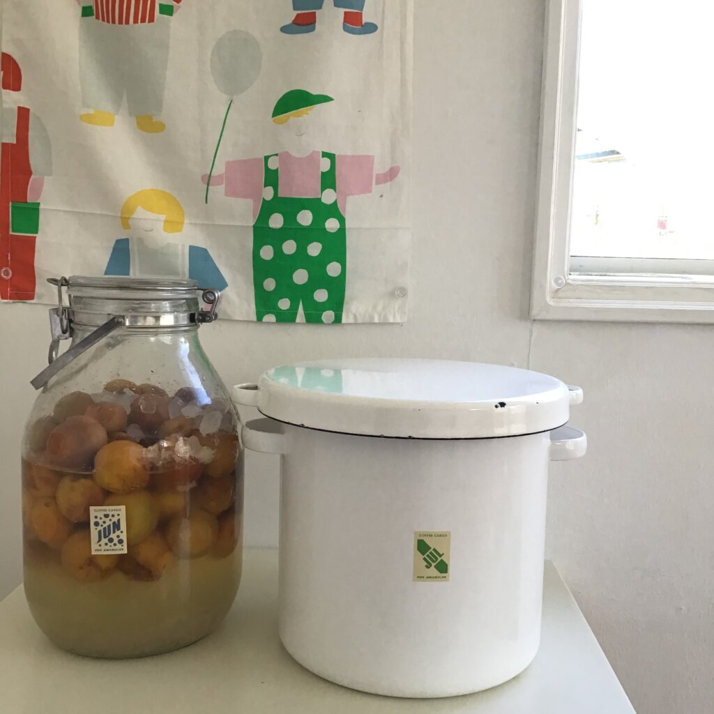 重石もジャムの空き瓶で簡単に。梅酢も黄梅だとすぐ上がってきますー。