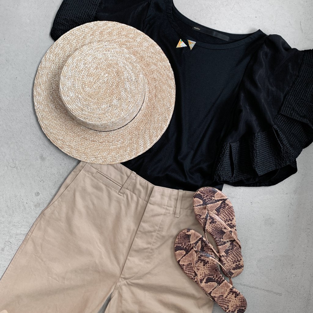 なので甘めのラッフルトップスは黒一色で抑えて、あとはチノにヘビ柄に・・・と可愛くならないように。これなら何とかイケる!